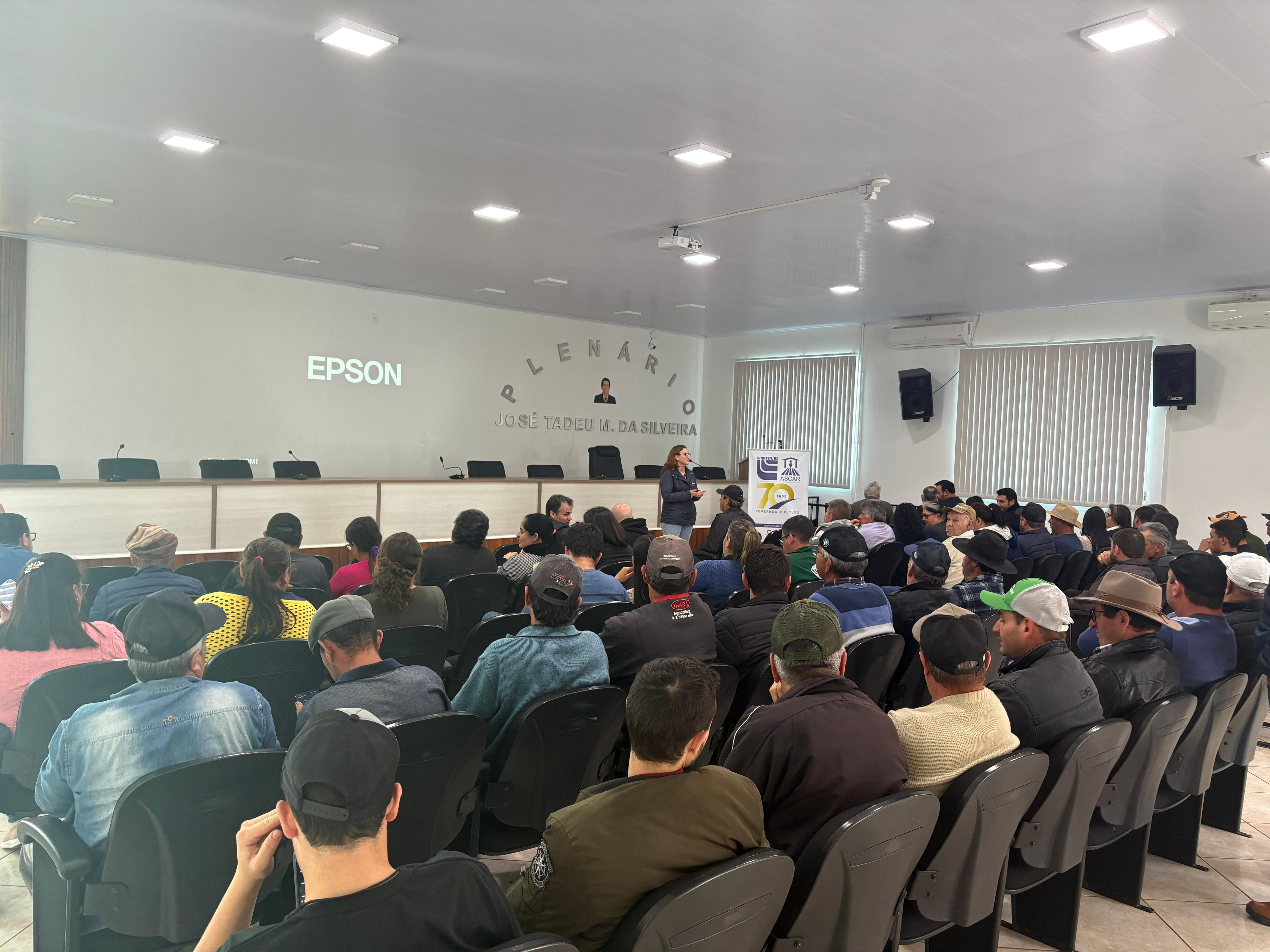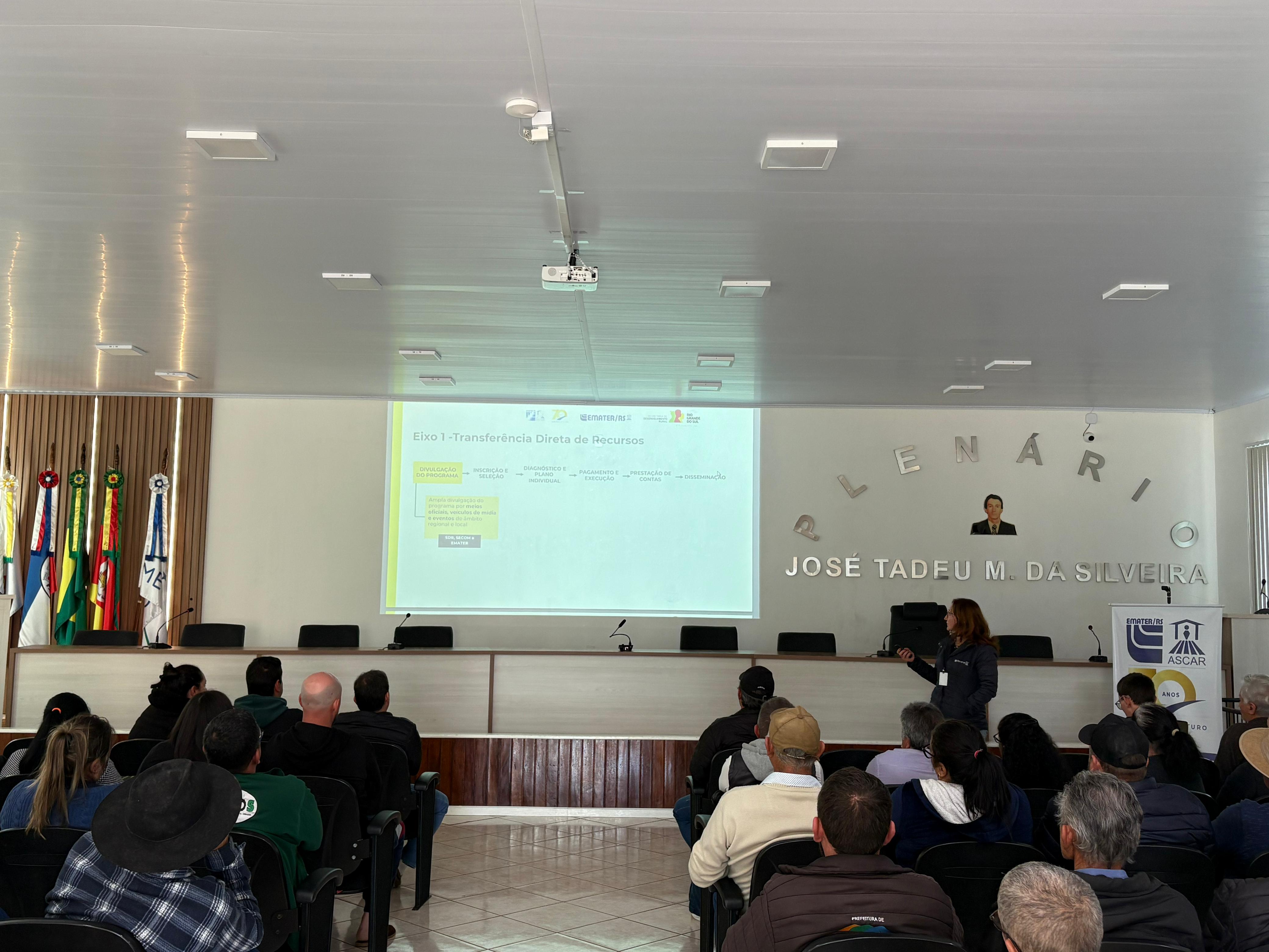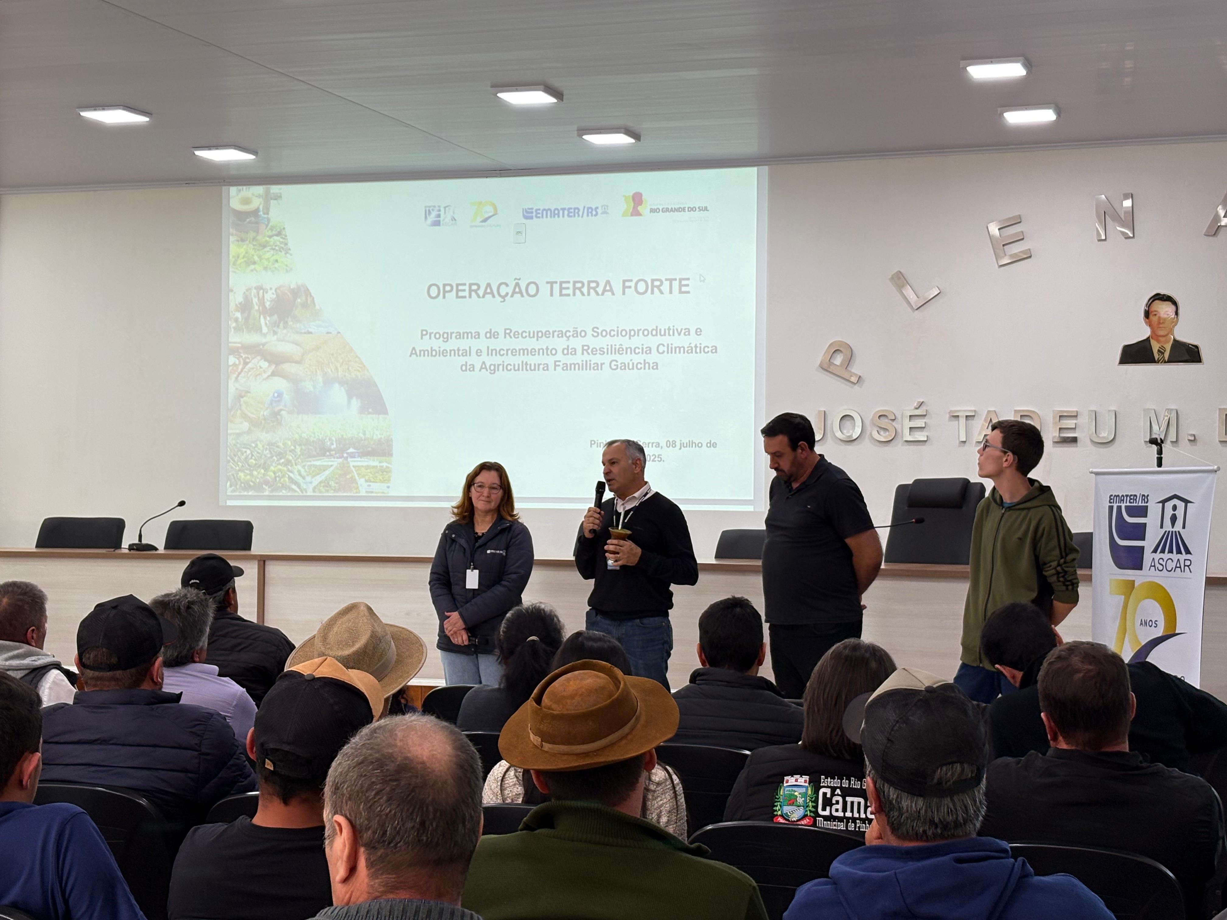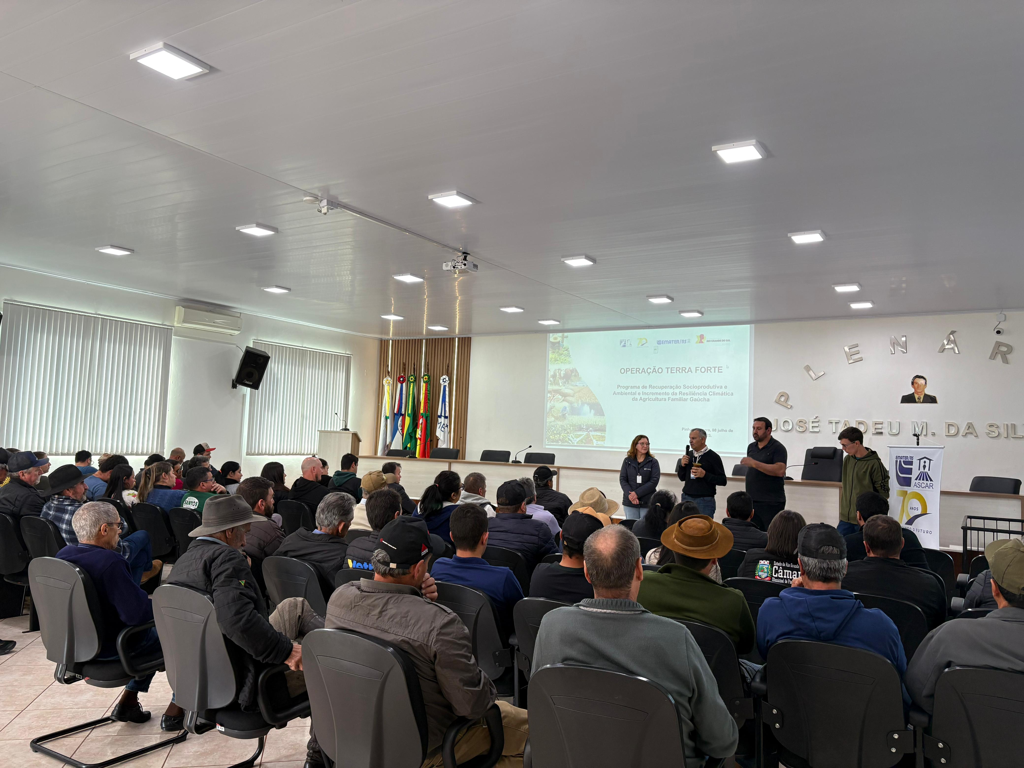 A apresentação foi conduzida pelos profissionais da EMATER, Silvana Buratti e Erick Schulz. O Programa Terra Forte visa fortalecer a agricultura familiar e o desenvolvimento sustentável no meio rural por meio de incentivos e assistência técnica. É uma iniciativa do Governo do Estado do Rio Grande do Sul, através da Secretaria de Desenvolvimento Rural (SDR), com o objetivo de promover a recuperação socioprodutiva e ambiental das propriedades da agricultura familiar, além de apoiar a adaptação às mudanças climáticas.