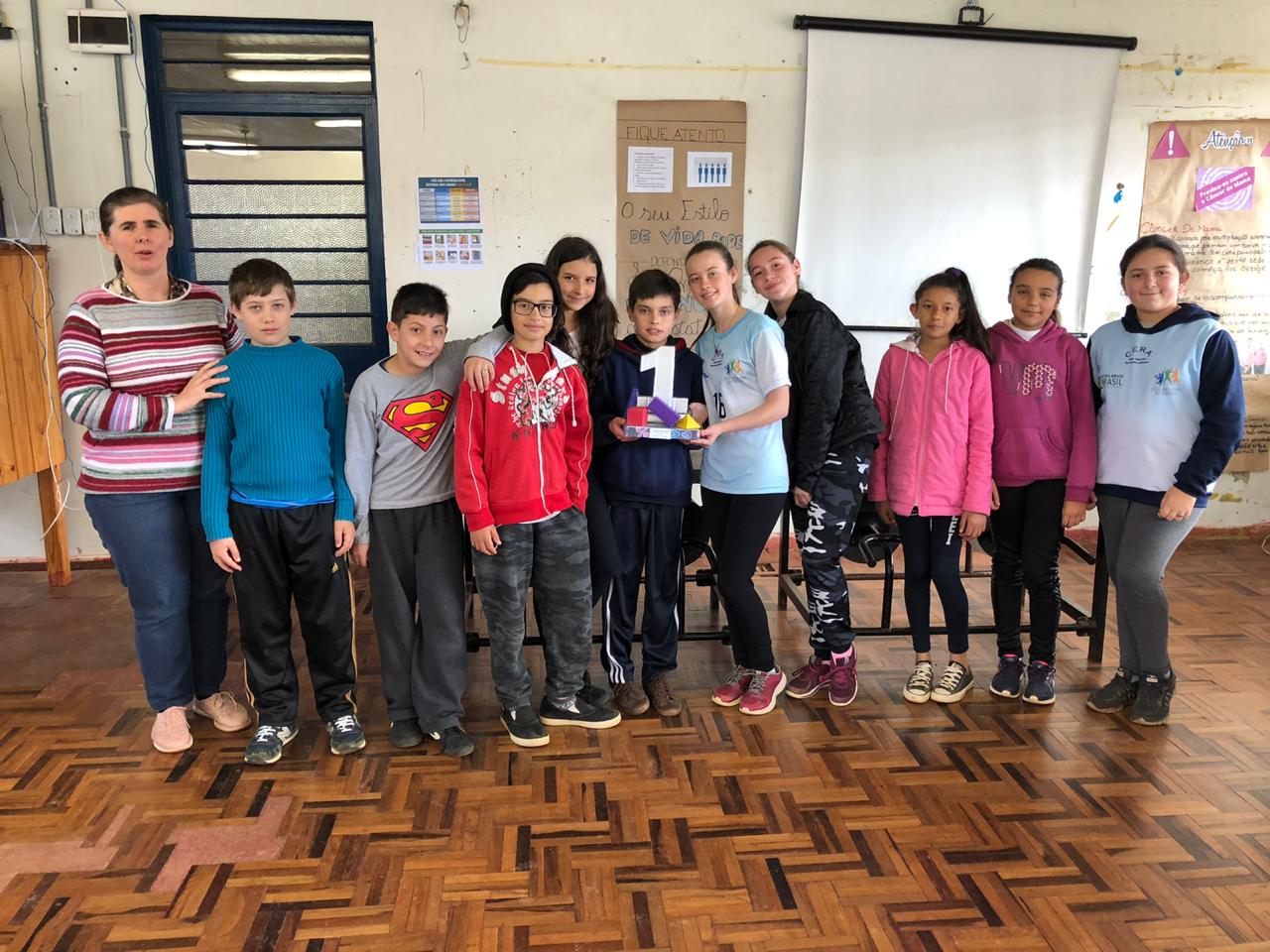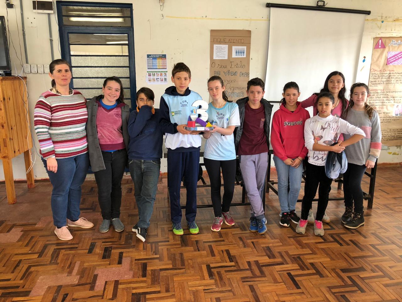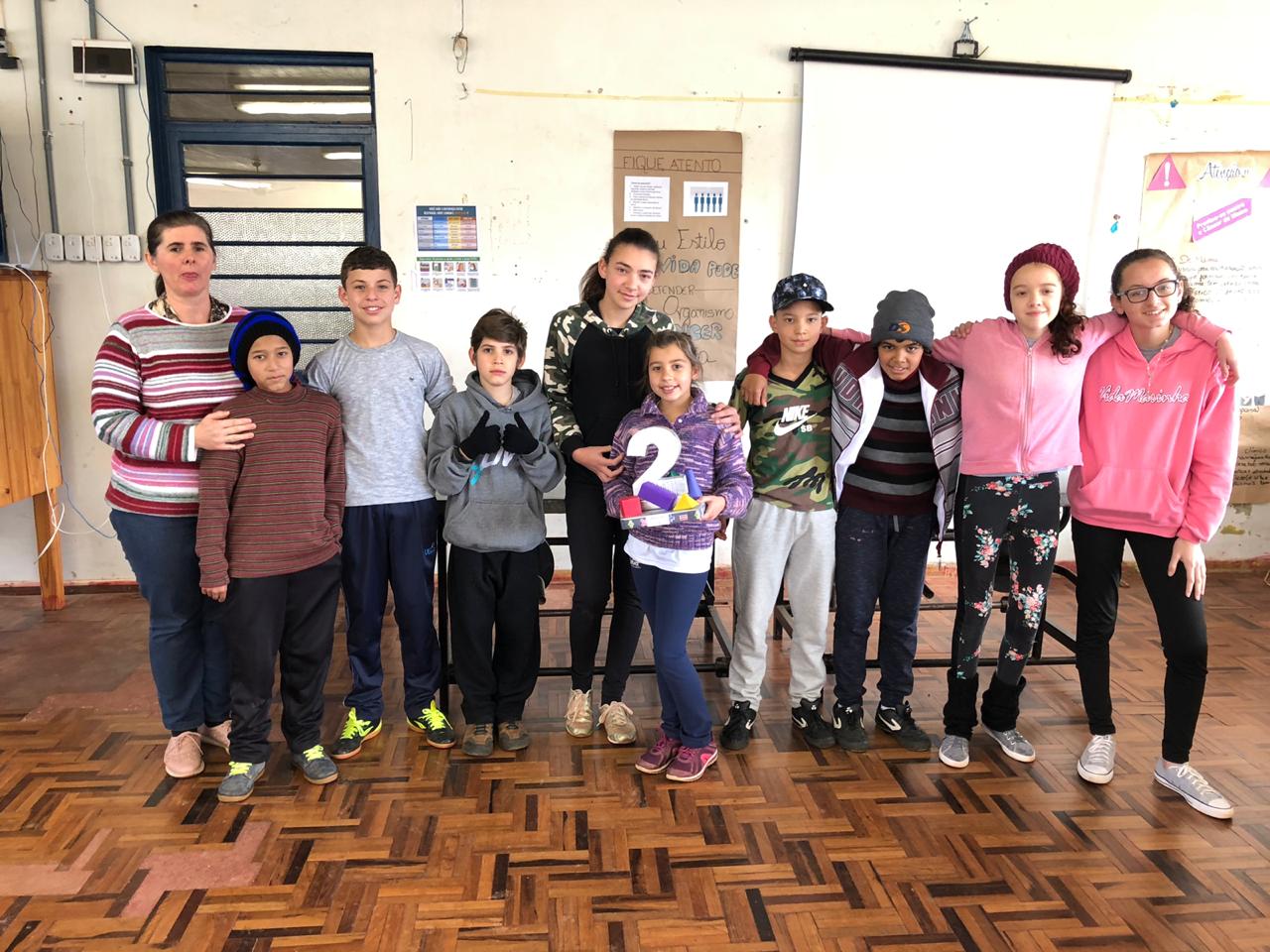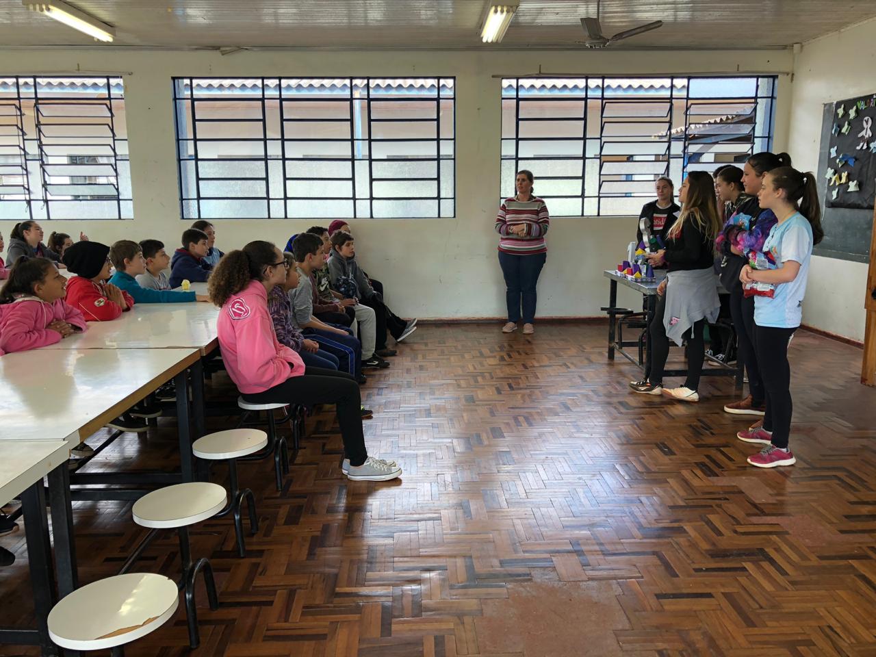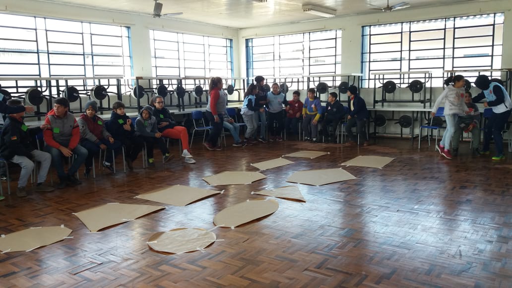 Os jogos foram desenvolvidos pela turma do 8º ano A para os estudantes do 6º ano, que foi dividida em três equipes com nomes de figuras geométricas: “quadrado”, “triângulo” e “circunferência”. Essa gincana foi o resultado das aulas da disciplina de Projeto de Matemática, orientada pela professora Elisiane Birck Moreira.