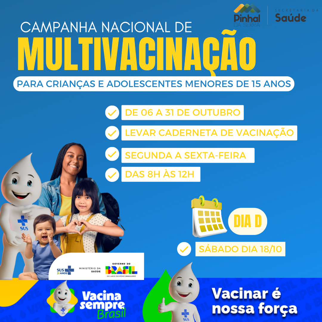 A partir de segunda-feira, dia 06 de outubro, até o dia 31 de outubro, a UBS realizará a campanha de multivacinação para crianças e adolescentes menores de 15 anos.