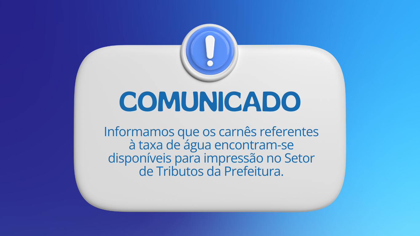 Informamos que os carnês referentes à taxa de água encontram-se disponíveis para impressão no Setor de Tributos da Prefeitura.