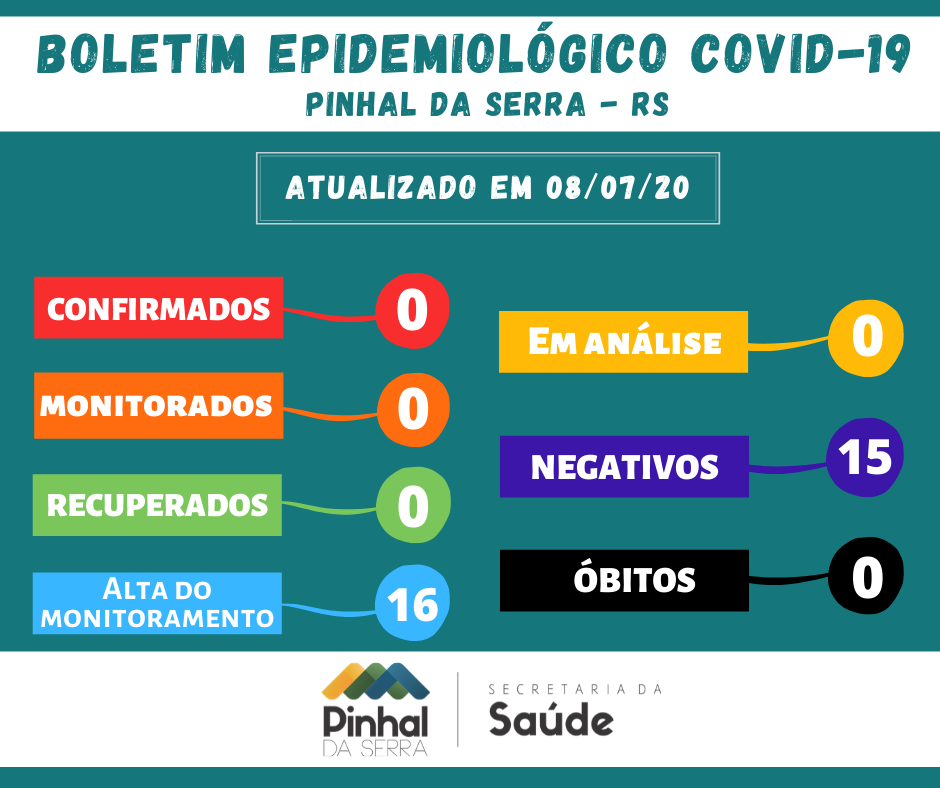 Atualização do boletim epidemiológico na data de hoje - 08/07/2020 - A Secretaria Municipal da Saúde realizou mais três testes rápido em possíveis contactantes de pessoas que deram positivo em Municípios vizinhos e um profissional da saúde que apresentou sintomas gripais, portanto os resultados deram negativos e os casos foram descartados. Reforçamos as medidas de proteção para o bem da nossa comunidade!