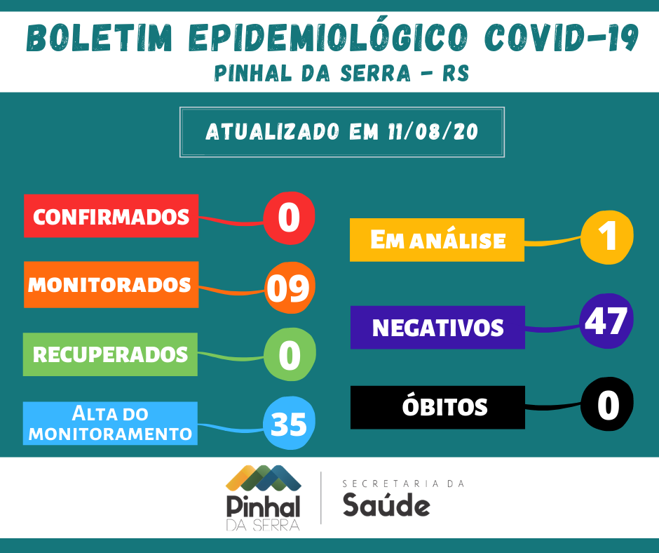 Atualização do boletim epidemiológico na data de hoje - 11/08/2020 - Duas pessoas tiveram alta do monitoramento, pois o teste da pessoa que teve o contato foi negativo. Foi realizado mais um teste rápido em outro paciente que segue em monitoramento com resultado negativo, porém apresenta sintomas e foi encaminhado ao laboratório entrando em análise. #PinhalDaSerraContraOCoronavírus #UseMáscara #Protejase