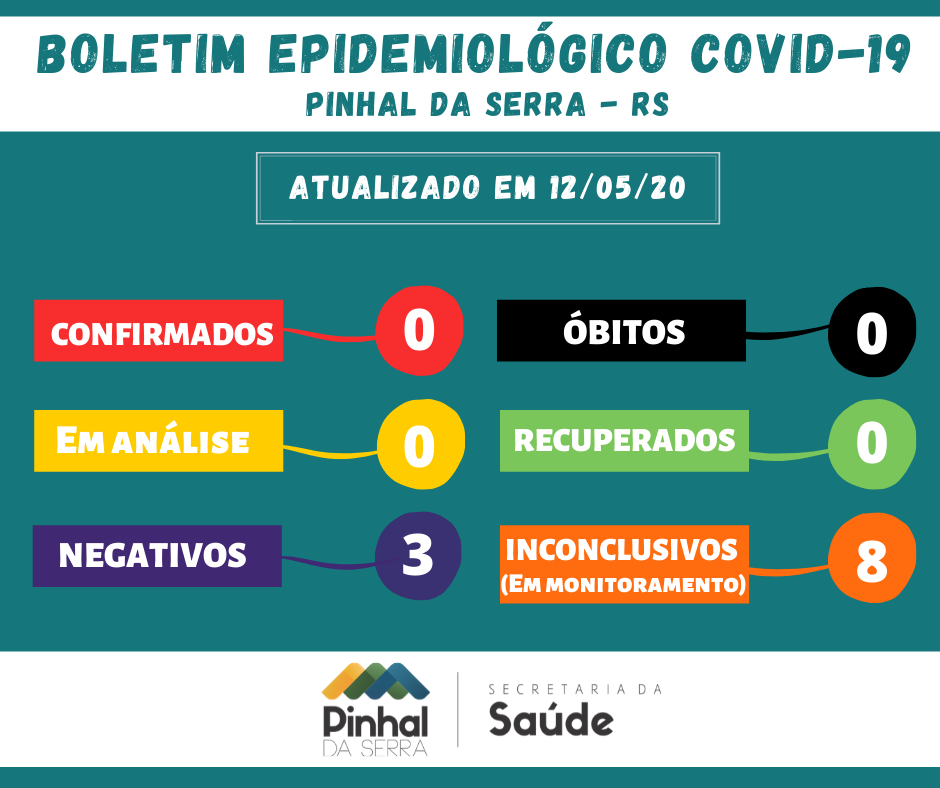 Atualização do boletim epidemiológico na data de hoje - 12/05/2020 - Os casos em monitoramento são moradores que tiveram contato com pessoas que testaram positivo em outras cidades, e estão em isolamento domiciliar durante o período de 14 dias.