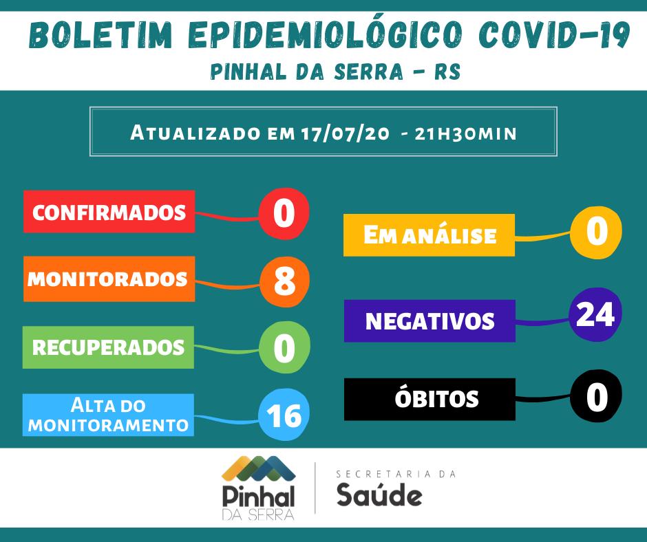 Atualização do boletim epidemiológico na data de hoje - 17/07/2020 - Oito pessoas estão em isolamento domiciliar por serem contactantes com caso positivo de outro município, e aguardam os dias que são preconizados pelo Ministério da Saúde para que possa ser realizado o teste novamente.