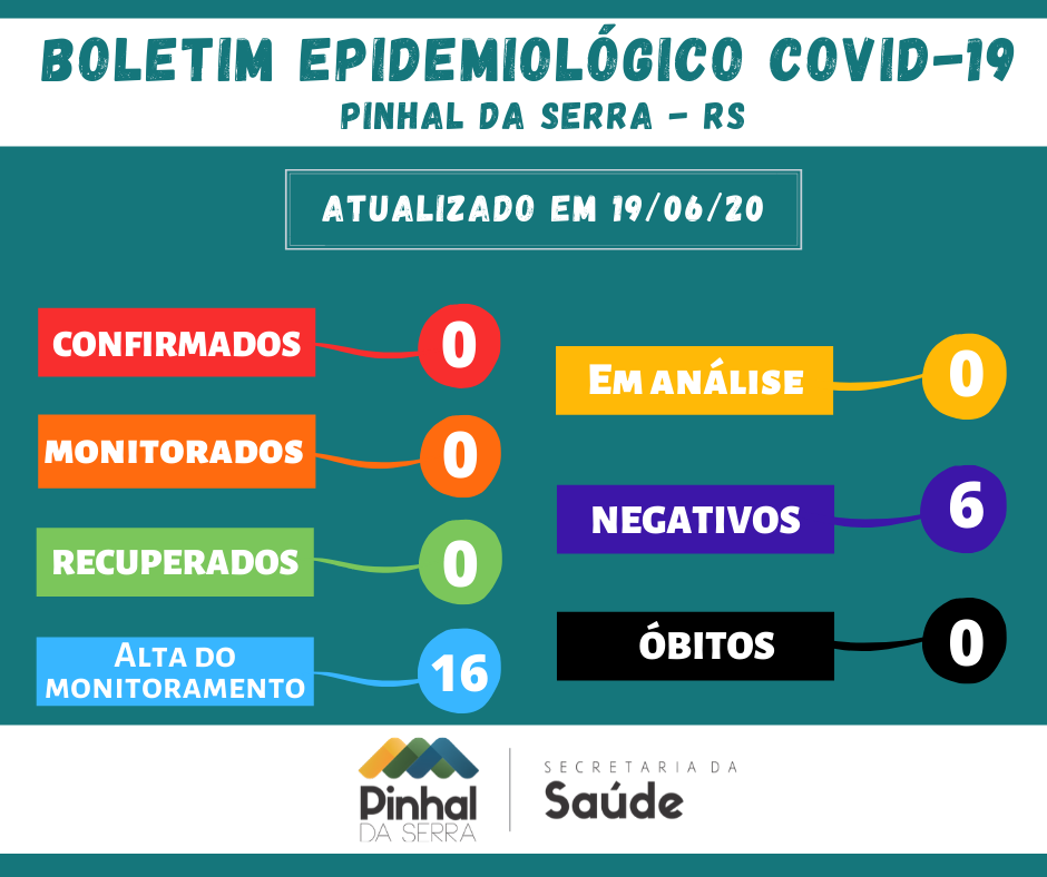 Atualização do boletim epidemiológico na data de hoje - 19/06/2020 - Finalizamos mais uma semana sem nenhum caso notificado! Reforçamos as medidas de prevenção para que toda população continue se protegendo, e o vírus não se propagar no Município.