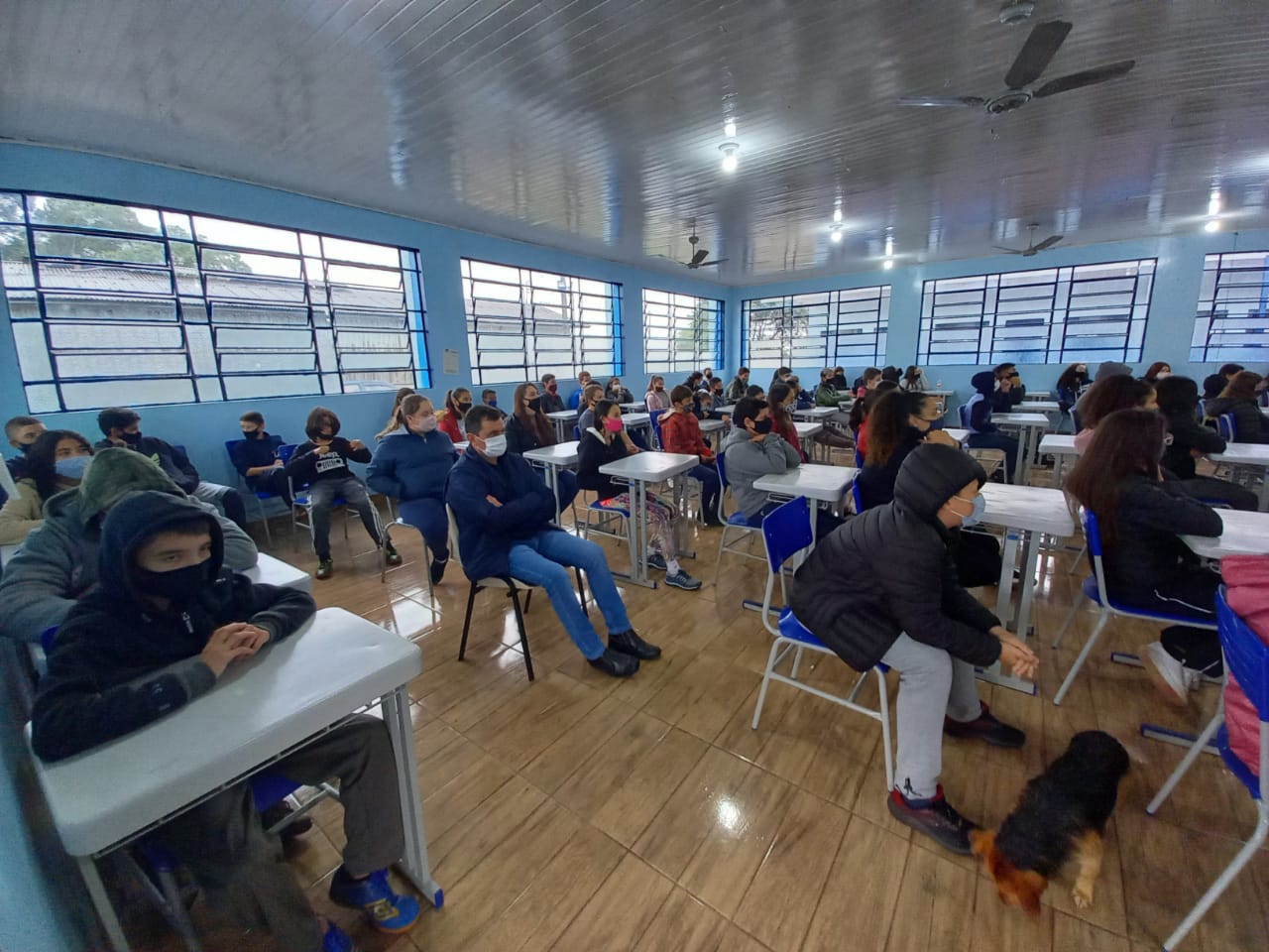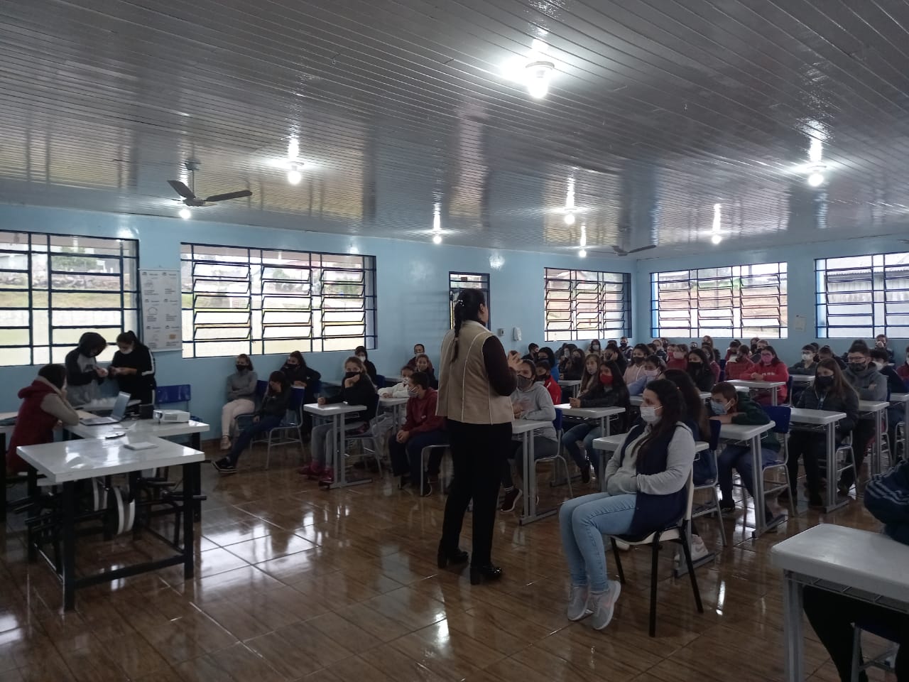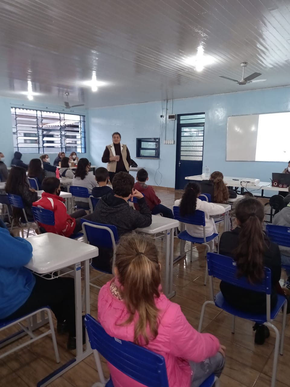 Na manhã de hoje (04/04), os estudantes dos Anos Finais do Ensino Fundamental das escolas Professor Tadeu Silveira e São Paulo de Tarso, participaram de uma palestra sobre Bullying com a assistente social Indianara Borges Reis.