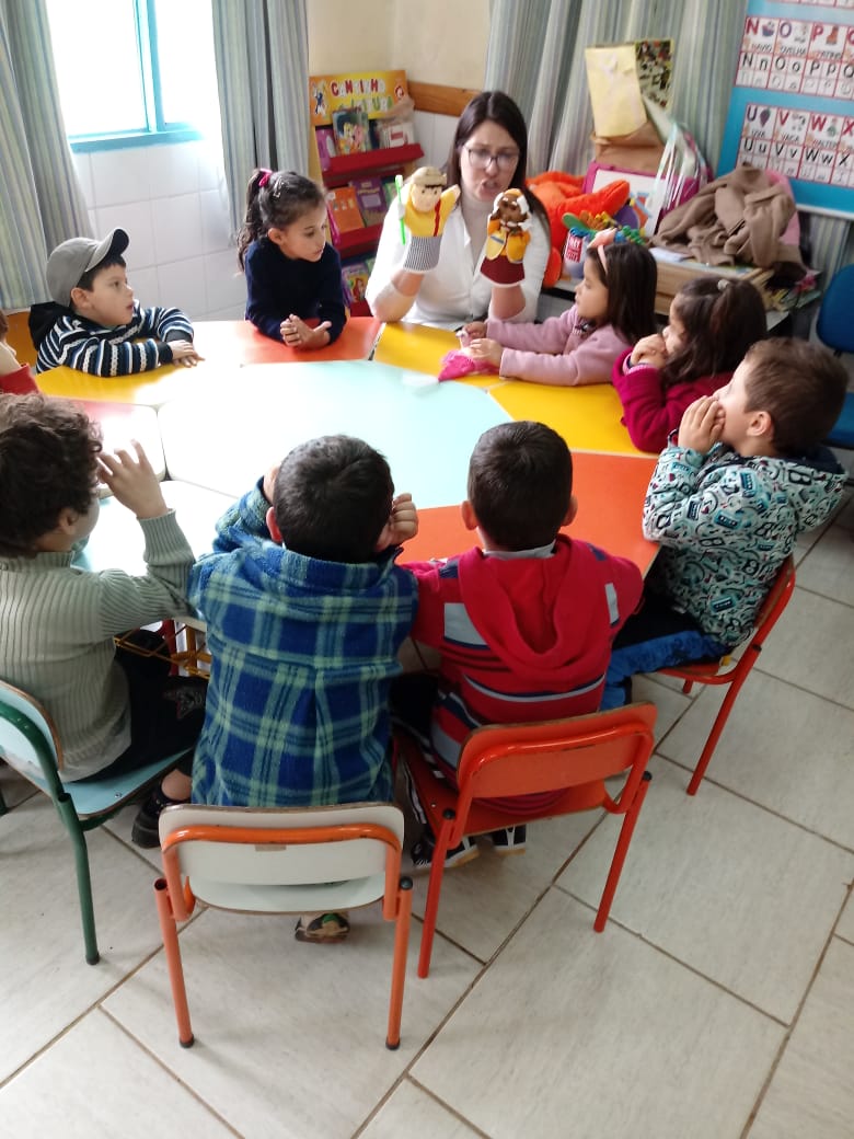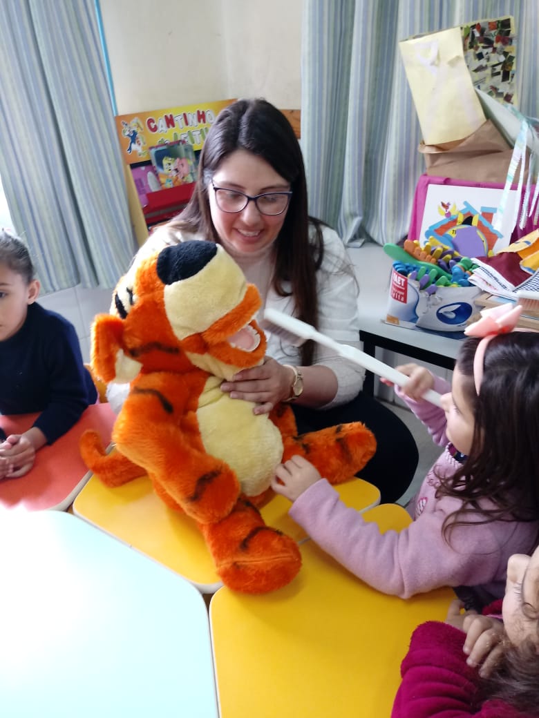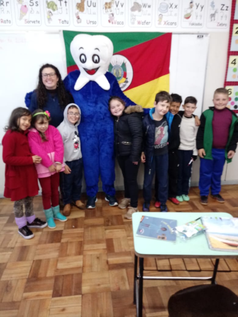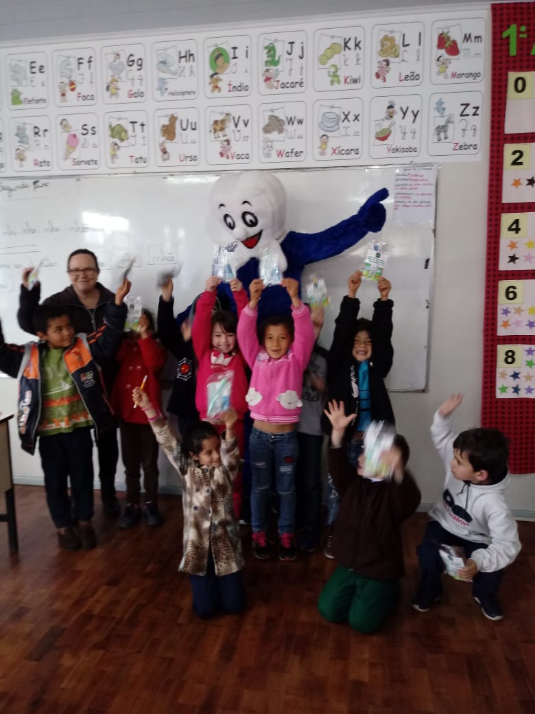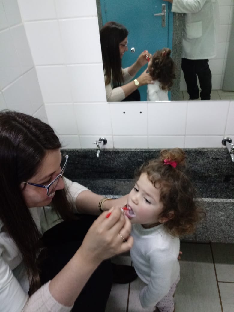 Durante os encontros, kits de saúde bucal com escova, creme e fio dental foram disponibilizados aos alunos, oportunizando um melhor cuidado com os dentes e a boca. Na Escola de Educação Infantil Tia Braia, diariamente as professoras acompanham as escovações e um dia da semana tem a supervisão da cirurgiã-dentista Luana Soares Kuze e auxiliar Rejane Fátima Mundo.