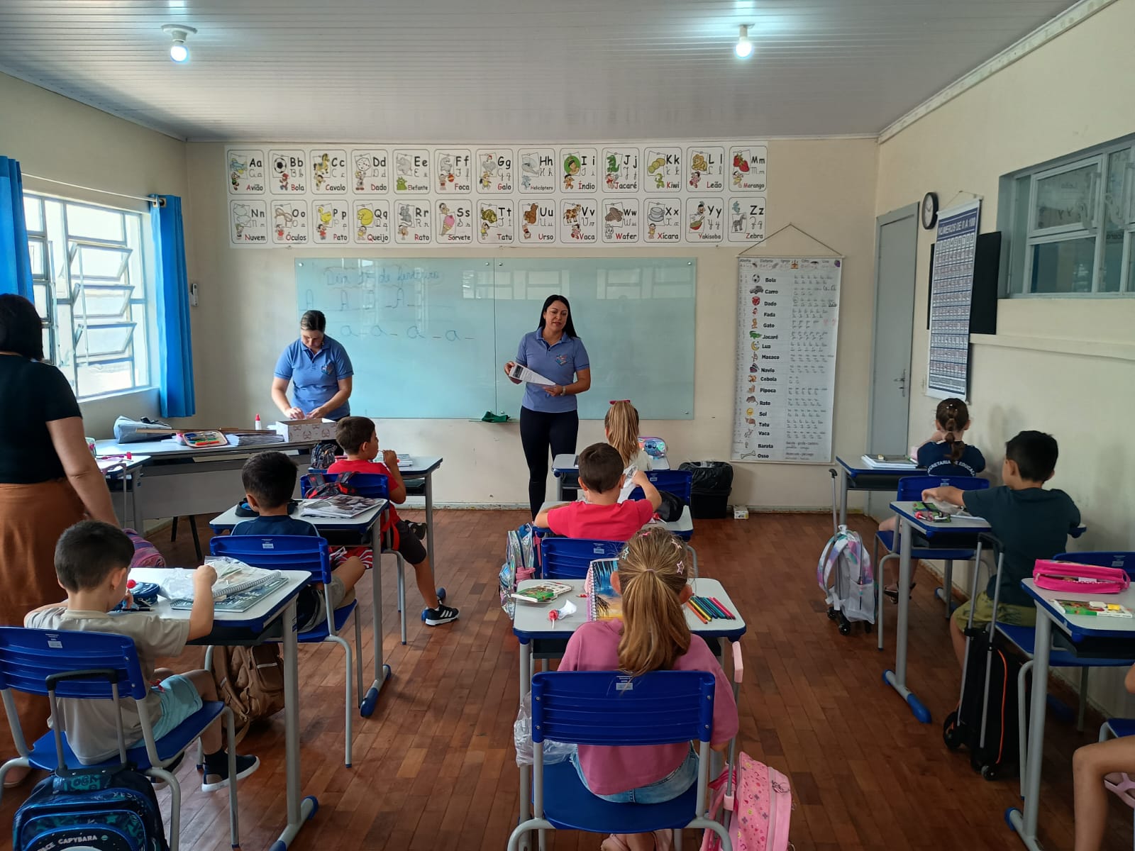 Os alunos dos anos iniciais foram recepcionados com uma acolhida especial, repleta de integração e boas-vindas, além da entrega dos materiais escolares.