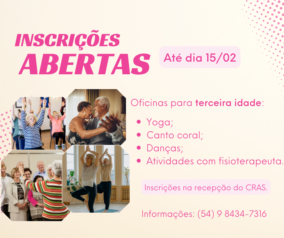 A Secretaria Municipal de Desenvolvimento Social e Habitação em parceria com o Instituto Humaniza e patrocínio da Engie, abrirá inscrições entre os dias 01 a 15 de fevereiro, para oficinas de yoga, canto coral, danças e atividades físicas com fisioterapeuta para idosos moradores de Pinhal da Serra que tenham 60 anos ou mais.