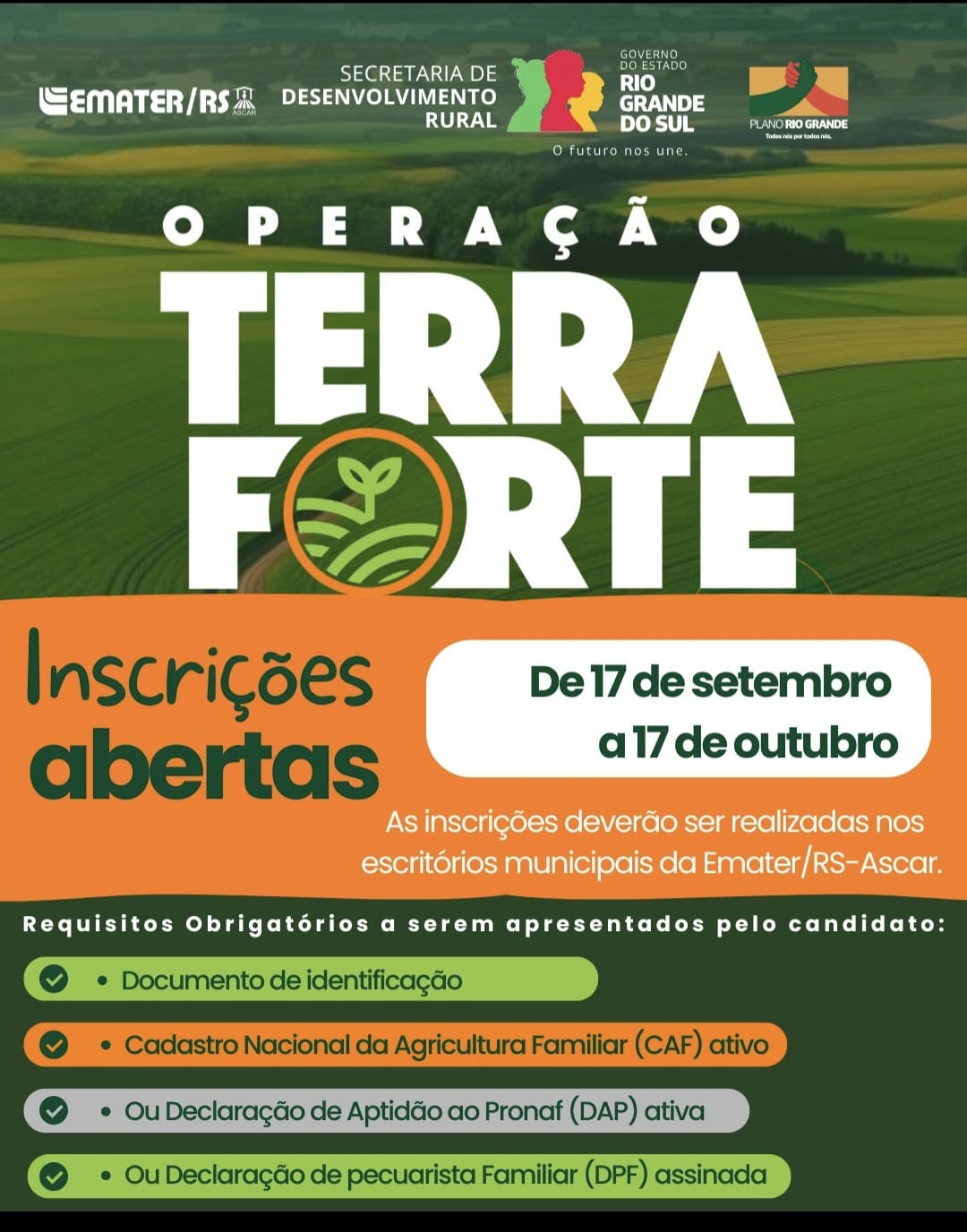 Atenção! Inscrições abertas no escritório da Emater do município. WhatsApp para contato: 54 99996-1085