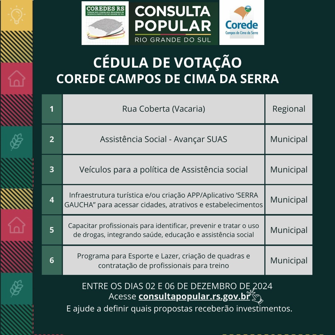 Até esta sexta-feira, 6 de dezembro, cidadãos de todo o Estado podem votar na Consulta Popular 2024, que define os projetos para o desenvolvimento regional. Durante esse período, você pode escolher as propostas que mais fazem sentido para o nosso Município, contribuindo para melhorar serviços e infraestrutura locais.