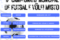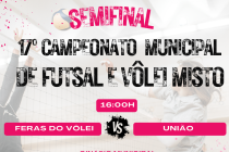 Neste domingo, dia 27 de julho, acontece mais uma rodada do Campeonato Municipal de Futsal e Vôlei Misto! A semifinal da categoria Vôlei Misto será disputada a partir das 17:00h no Ginásio Municipal.