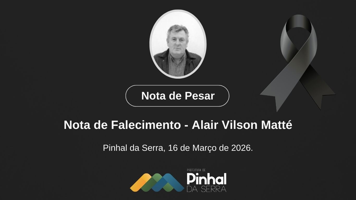 A Prefeitura Municipal de Pinhal da Serra manifesta profundo pesar pelo falecimento de Alair Vilson Matté, aos 65 anos, ocorrido nesta segunda-feira.