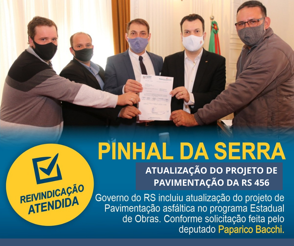 Conforme a assessoria do gabinete do Deputado Paparico Bacchi, a atualização do projeto de acesso asfáltico da RS 456 que liga Pinhal da Serra à Esmeralda vai avançar. Sem projeto, não há obra. Nesta quarta-feira (9), o governo do Estado anuncia o investimento para atualização do projeto que vai concretizar o acesso asfáltico em Pinhal da Serra.
