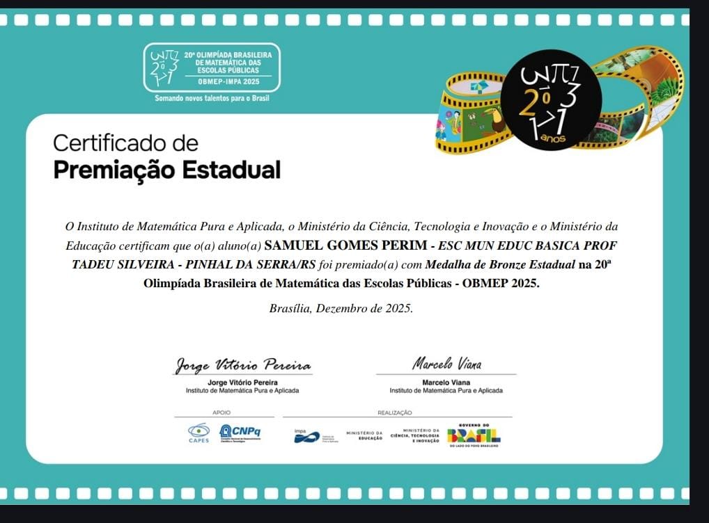 A EMEB Professor Tadeu Silveira, do município de Pinhal da Serra, celebra com imensa alegria a participação e premiação de nossos alunos na Olimpíada Brasileira de Matemática das Escolas Públicas (OBMEP 2025).