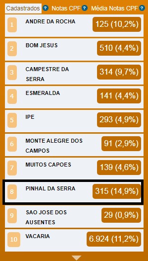 Pinhal da Serra é a cidade que possui a porcentagem mais elevada de pessoas cadastradas no Programa na região dos Campos de Cima da Serra, totalizando 14,9% até o momento desta publicação.