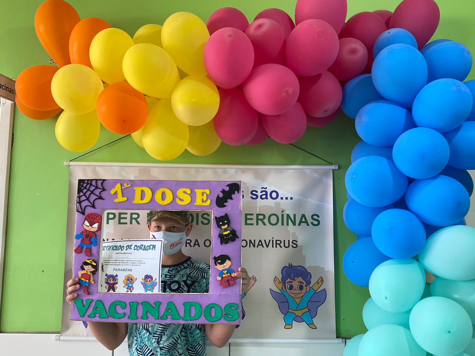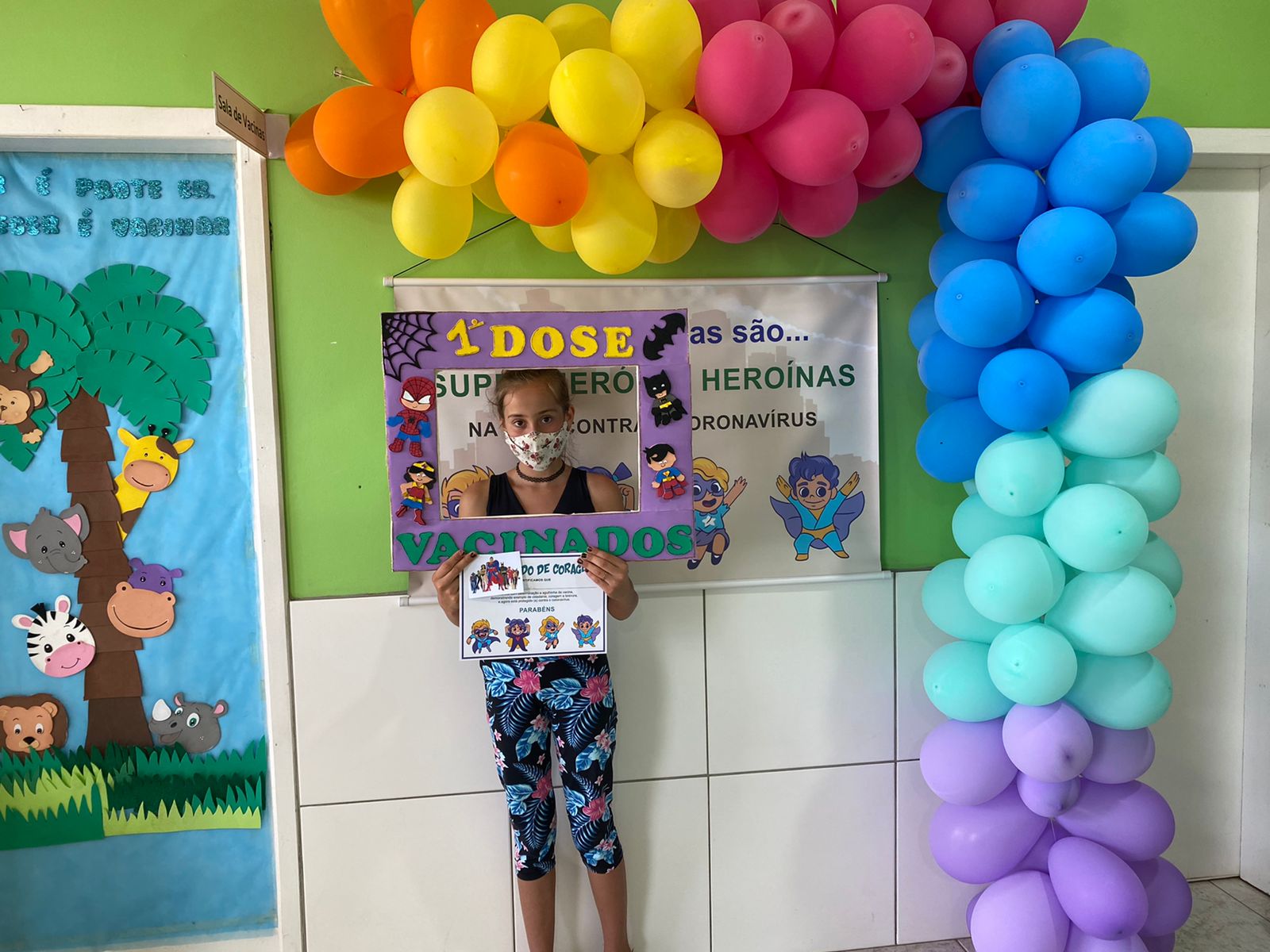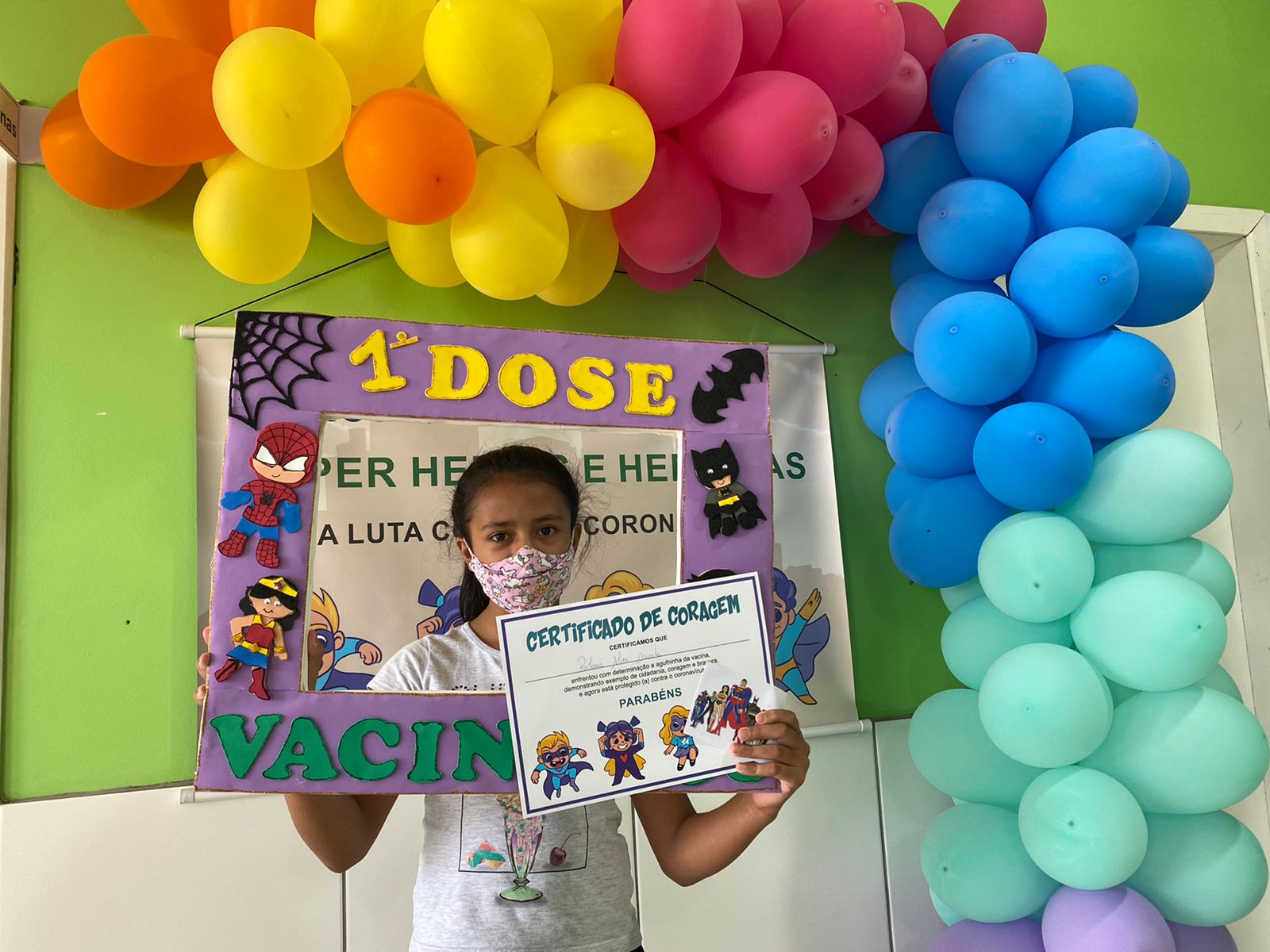 Após a vacinação, as crianças recebem pirulito, certificado de coragem, adesivos de super-heróis e tiram fotos em um painel decorativo. Até o momento foram recebidas 40 doses pediátricas, a orientação do intervalo entre a 1ª e a 2ª dose é de 8 semanas para Pfizer e 28 dias para a Coronavac.