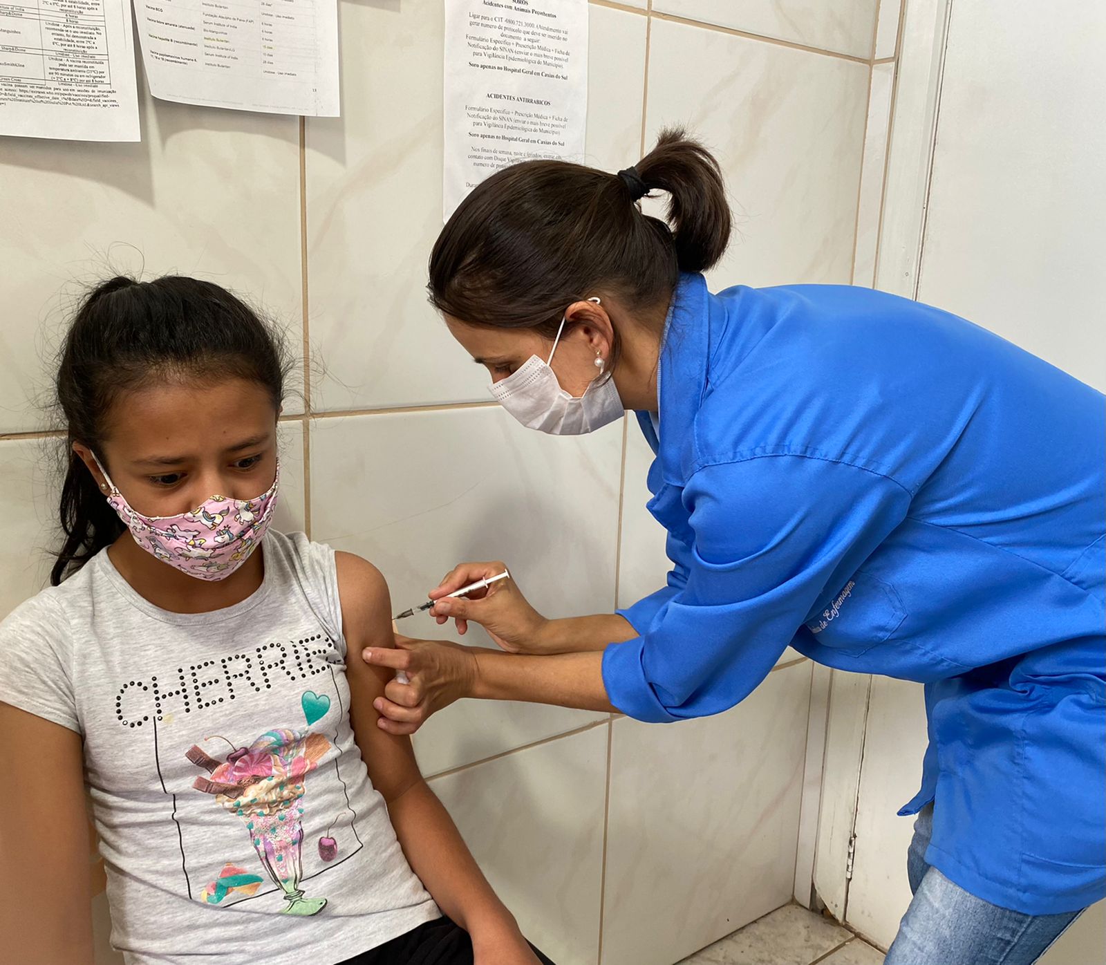 A equipe da Secretaria da Saúde está realizando a vacinação de acordo com as orientações do Governo Estadual, ou seja, iniciou com crianças que possuem alguma comorbidade, e deu sequência com faixa etária de forma decrescente.