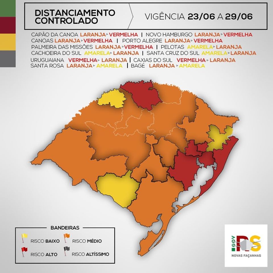 Conforme determinado no Diário Oficial do Governo do Estado do Rio Grande do Sul as regras referentes à bandeira laranja já podem ser cumpridas a partir desta segunda-feira, (22/06), na região da serra gaúcha. A região de Caxias do Sul, que inclui 49 municípios, inclusive Pinhal da Serra, deixou a bandeira vermelha e voltou à bandeira laranja no modelo de distanciamento controlado do governo do Estado, conforme divulgação no último sábado, (20/06). A principal mudança é reabertura do comércio com 50% da capacidade de operação.