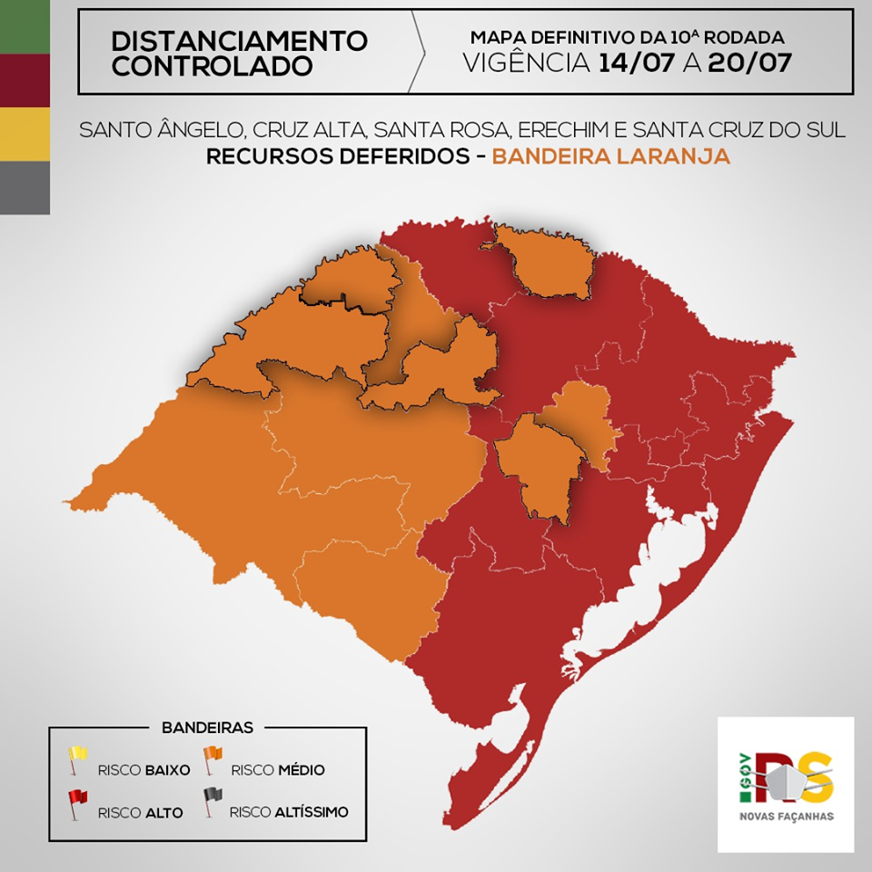 As cidades que não registraram mortes e hospitalização por covid-19 nos últimos 14 dias poderão seguir com restrições menos severas. Na sexta-feira (10/07), o Governo Estadual anunciou que a Serra voltou a ser considerada região de alto risco para o contágio de coronavírus. Dos municípios da região que têm leitos de UTI, todos também estão incluídos nas regras mais rígidas. As vagas de terapia intensiva na Serra estão concentradas em Caxias, Bento, Farroupilha, Garibaldi e Vacaria.