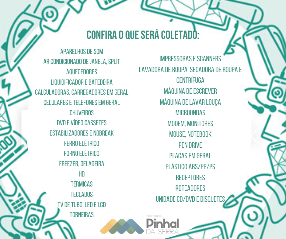 Serão coletados aparelhos que ficam obsoletos como monitores, computadores, telefones celulares, câmeras, impressoras, geladeiras, térmicas, freezer, chuveiro, toda linha de eletrodomésticos, entre outros. No entanto, na ocasião, não haverá recolhimento de pilhas e lâmpadas.