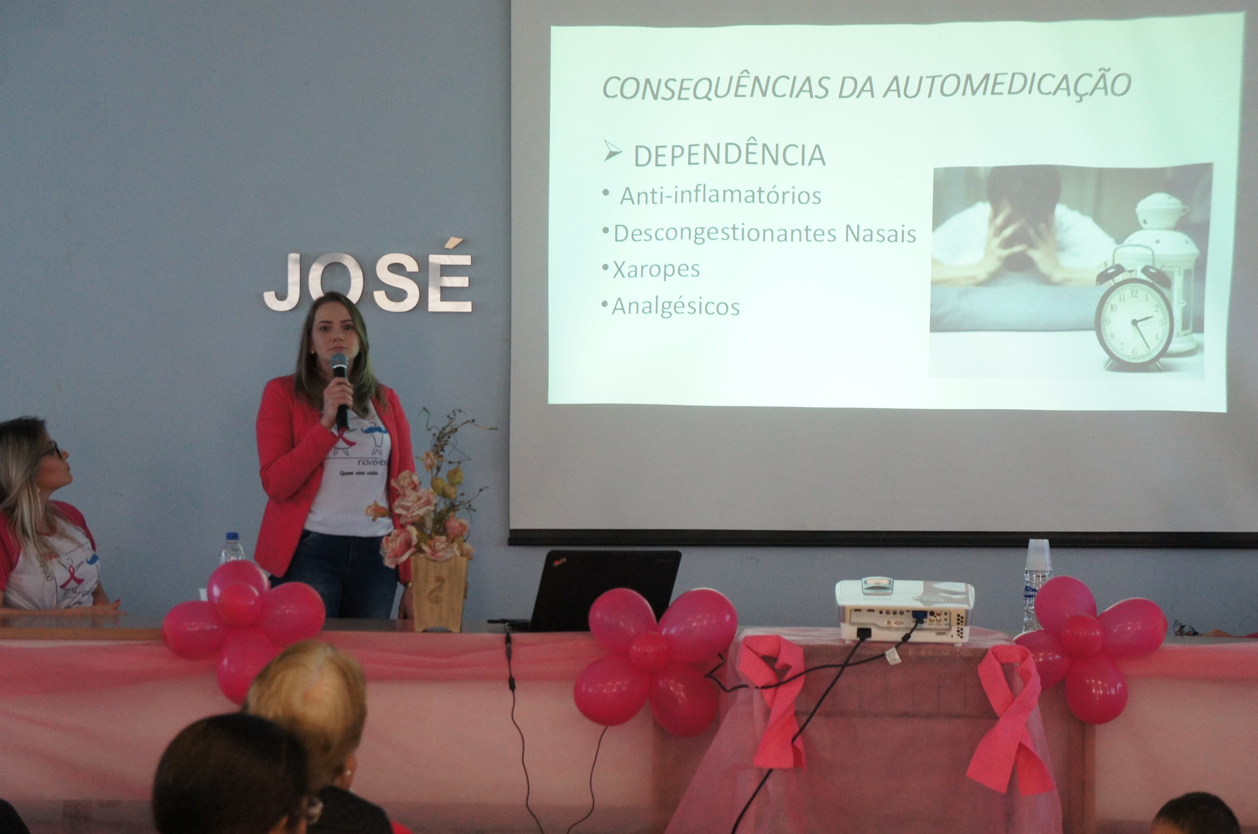 A farmacêutica Jéssica Zotti, através do tema Automedicação, mostrou o quanto é necessário ter cuidado na quantidade de medicação ingerida, pois os exageros podem causar consequências prejudiciais ao organismo e enfatizou que a medicação auxilia no tratamento, porém há outras formas de sentir-se bem.