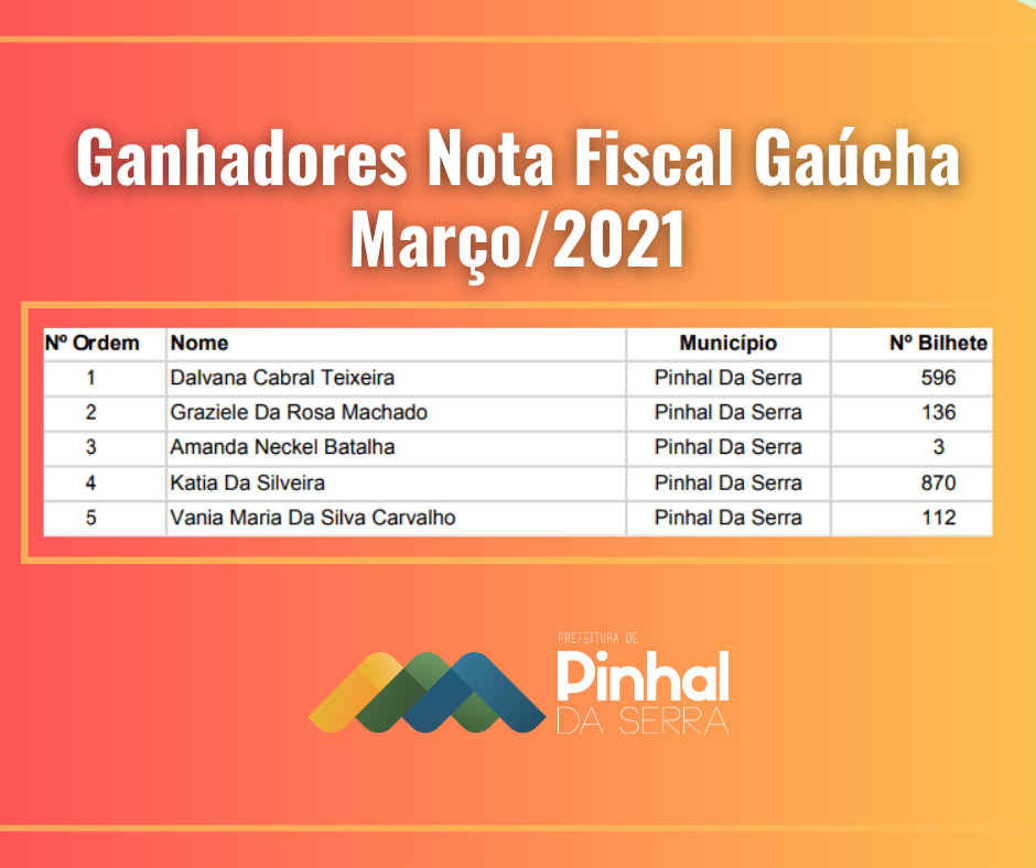O sorteio do Programa Nota Fiscal Gaúcha, referente ao mês de março, contemplou cinco pessoas que compraram no Município e pediram a inclusão do CPF no cupom fiscal. Cada ganhador receberá a quantia de R$ 100,00 pagos pela Prefeitura de Pinhal da Serra.