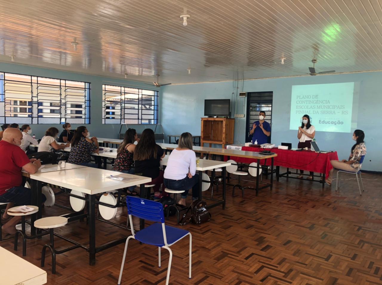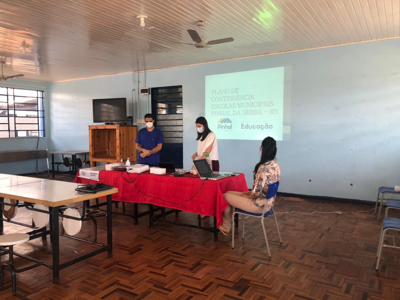 Desde o final da última semana, professores e funcionários da rede municipal de ensino de Pinhal da Serra participam de capacitações para o retorno das atividades escolares de modo híbrido, ou seja, as turmas ficam divididas com atendimento presencial de 3 horas e cumprindo o restante da carga horária com atividades domiciliares.