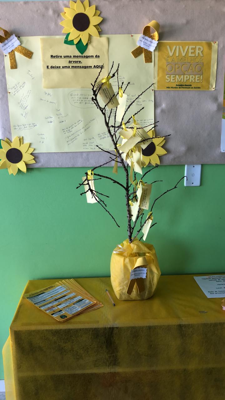 No saguão de entrada da Unidade Básica de Saúde, foi confeccionado uma árvore com frases motivacionais e um mural com espaço para que as pessoas deixem sua mensagem de apoio, tornando mais positivo o dia de quem lê.