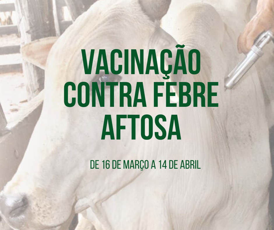 A primeira etapa de vacinação contra a febre aftosa ocorrerá entre os dias 16 de março e 14 de abril de 2020. Essa antecipação da campanha de vacinação tem por objetivo cumprir os prazos e trâmites para a suspensão da vacinação FA no Estado ainda neste ano. Nessa etapa que se inicia em março, todos os bovinos e bubalinos deverão ser vacinados, como ocorre regulamente nas primeiras etapas de vacinação.