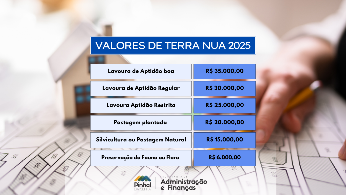 A Receita Federal divulgou os valores de terra nua para cálculo do Imposto Territorial Rural (ITR) no município de Pinhal da Serra para o exercício de 2025. Esses valores são fundamentais para determinar o imposto devido pelos proprietários rurais e variam de acordo com a classe de aptidão agrícola e a localização do imóvel.