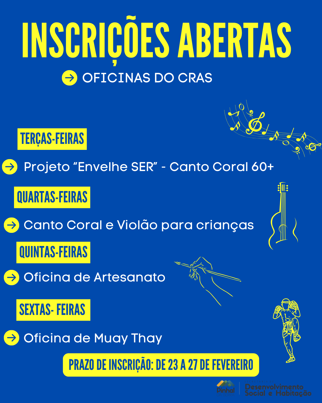 As oficinas terão início no mês de março, nos dias específicos de cada atividade, conforme informado na imagem.